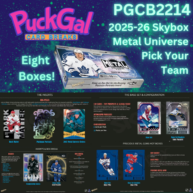 EIGHT BOXES BRAND NEW RELEASE Upper Deck 2025-26 Skybox Metal Universe Hobby! 15 packs, 6 cards per pack. Each Box contains 1 Autograph or PMG Card, 1 Numbered Parallel, and 2 Outer Limits Cards, on average! Total 90 cards per box