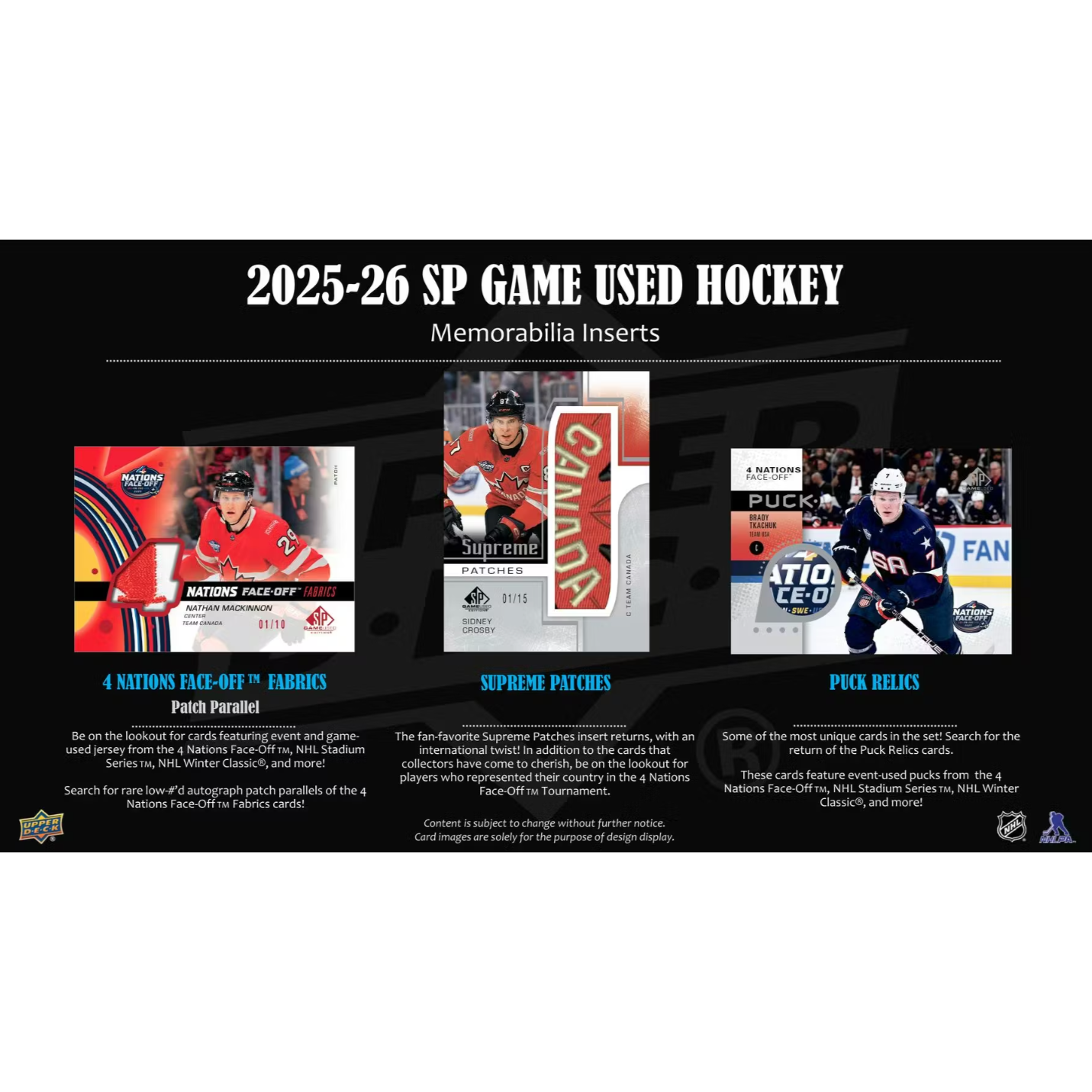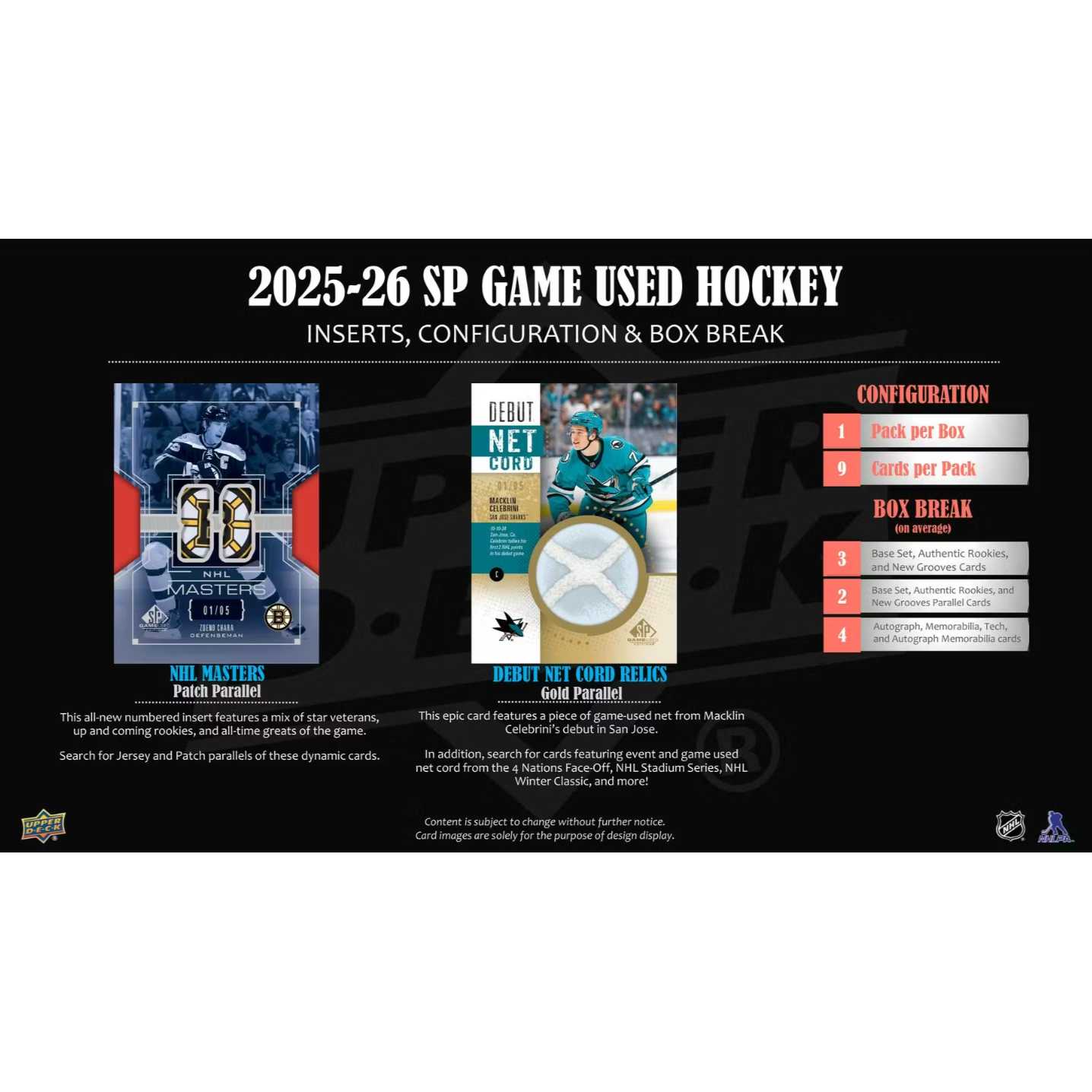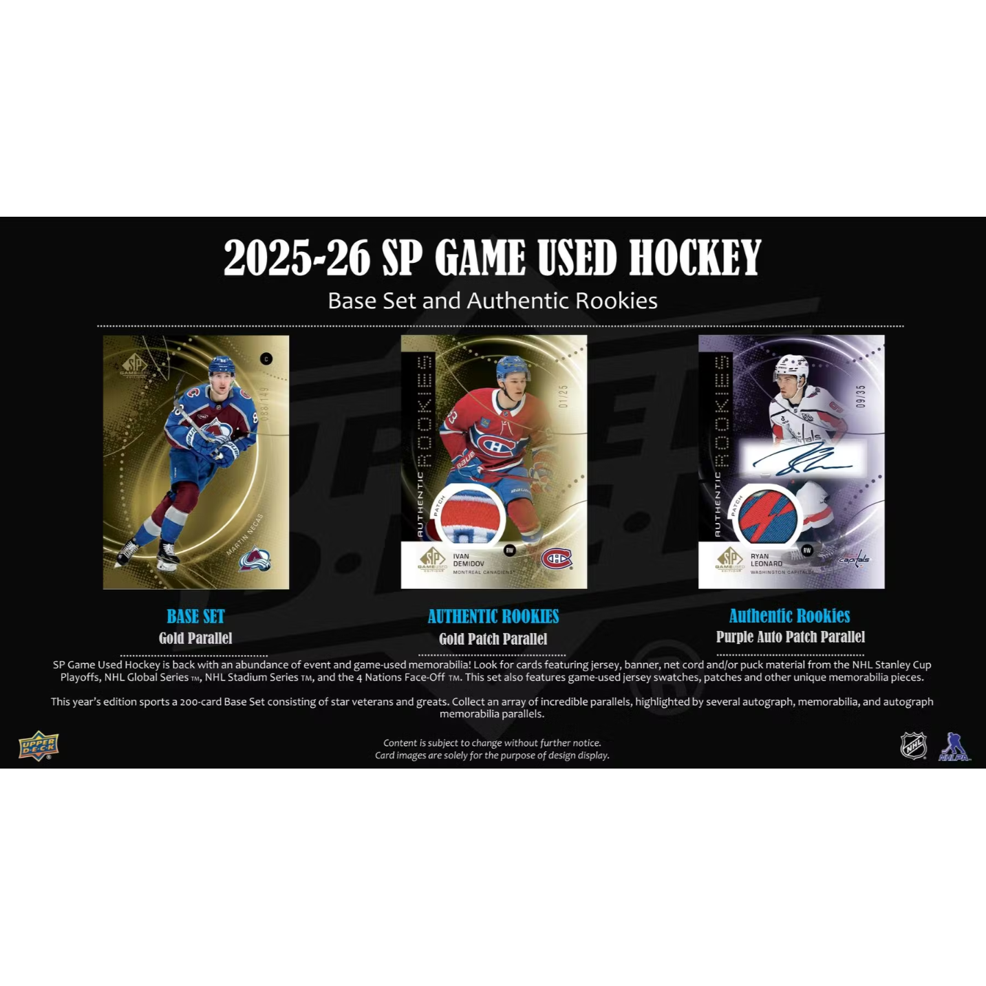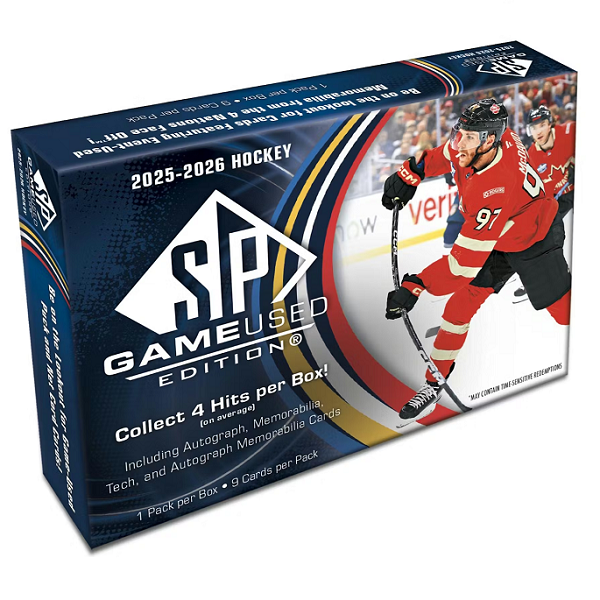 TEN BOXES OF NEWEST RELEASE Upper Deck 2025-26 SP Game Used!Every Box contains Four Autograph, Memorabilia, Tech or Autograph Memorabilia Cards, Three Base Set, Authentic Rookies and New Grooves Parallel Cards & Two Base Set, Authentic Rookies and New Grooves Cards! Total 9 cards per box