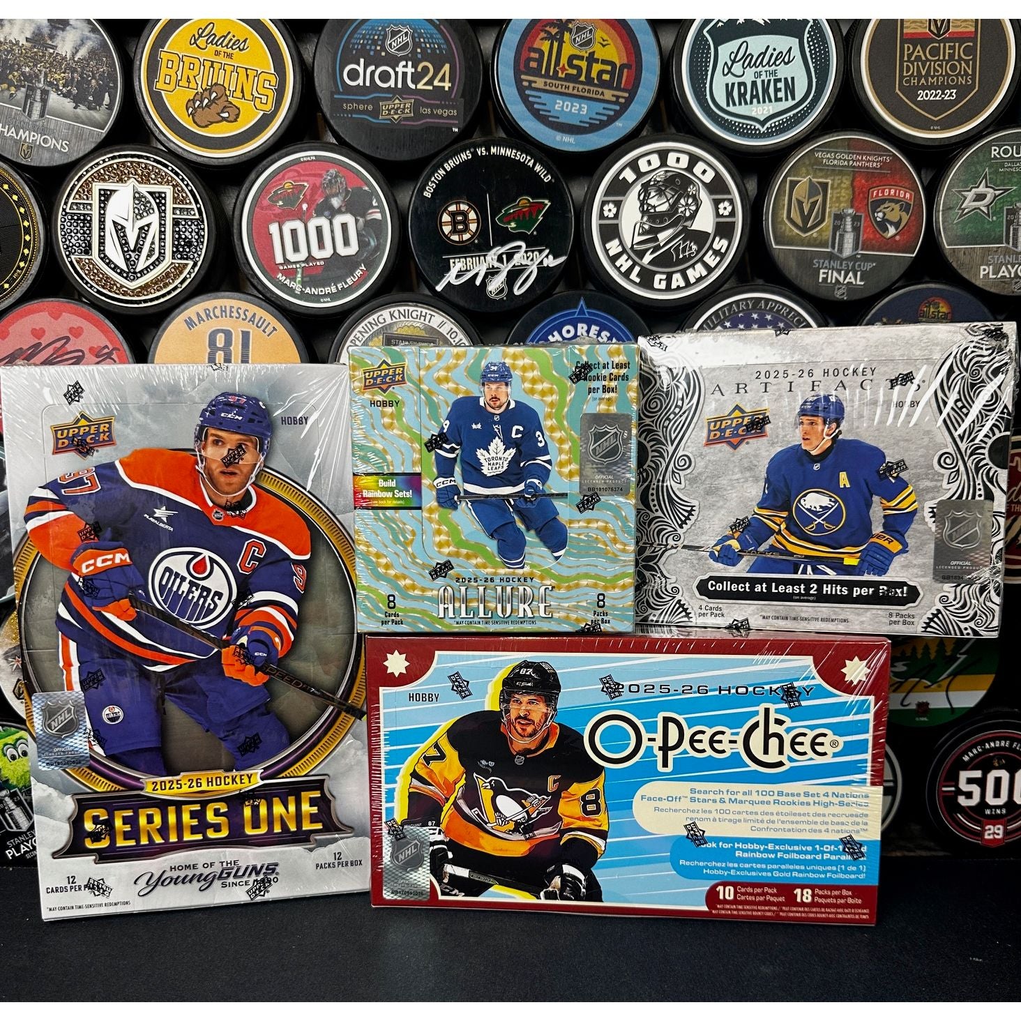 Upper Deck 2025-26 Upper Deck Series One! 12 packs, 12 cards per pack! Each Box contains Six Young Guns, Four UD Canvas, Four Encore, One Outburst Silver Parallel, and One Blue Dazzlers, on average!Total 144 cards per box.