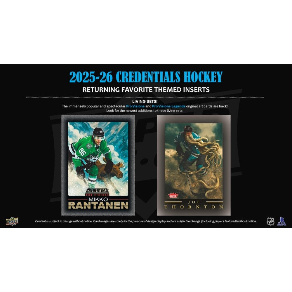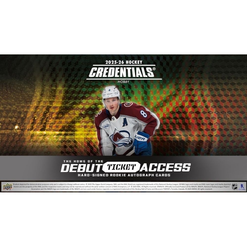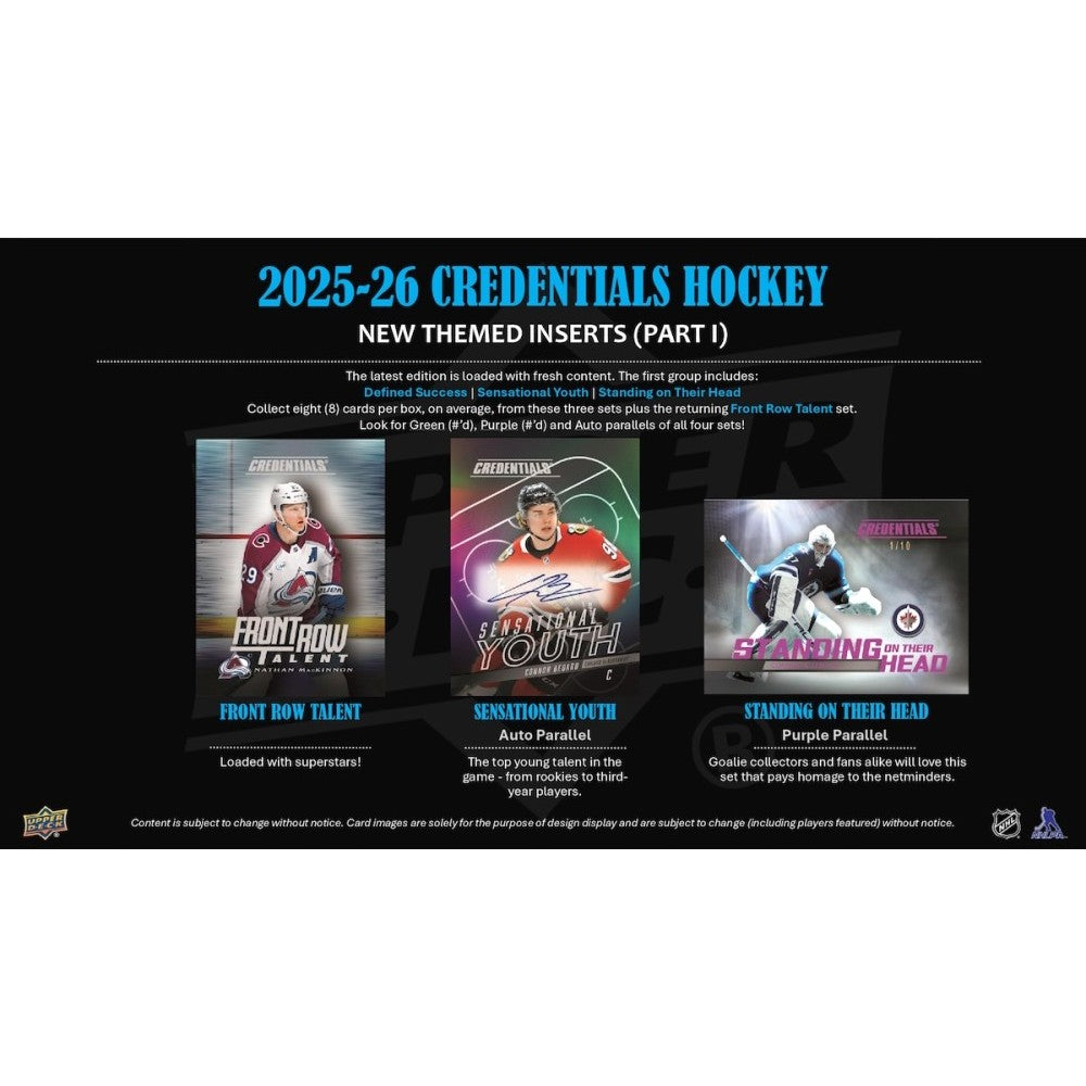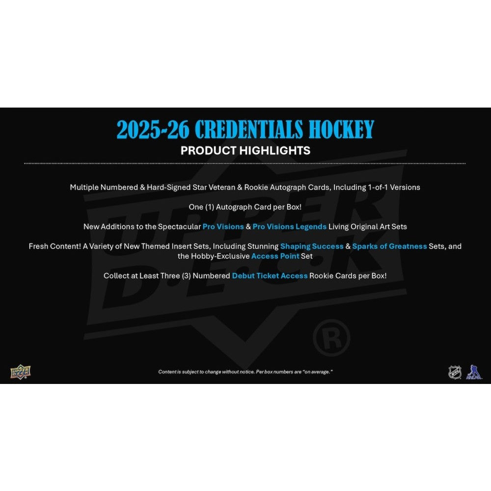 TEN Boxes of the BRAND NEW RELEASE Upper Deck 2025-26 Credentials Hockey Hobby!Each Box contains 1 Autograph Card and 1 Shaping Success or Sparks of Greatness Card, on average! Total 48 cards per box.
